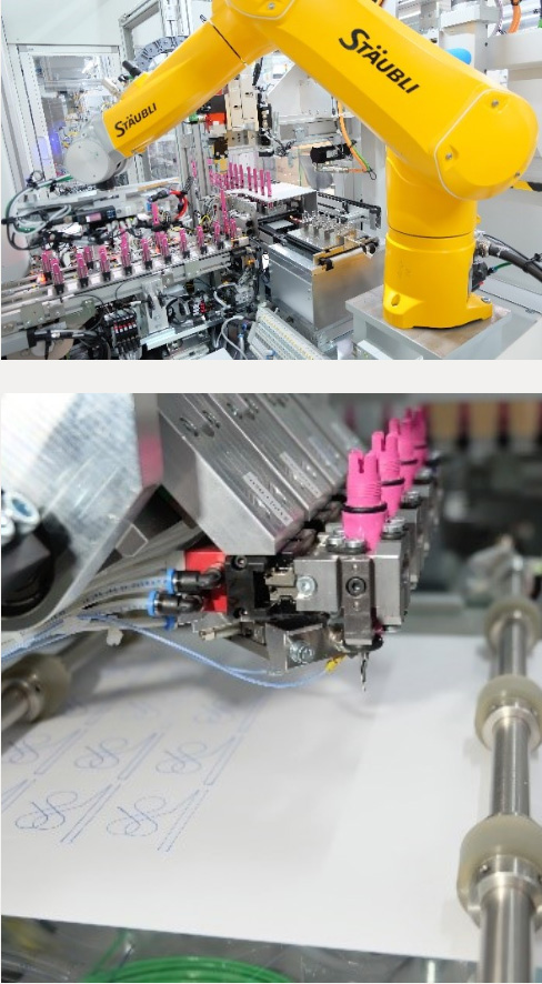 客户高度重视产品质量,因此所有装配完成的钢笔,都需通过全自动书写性能测试。测试时,每支钢笔的书写单元都会完成注墨操作。墨水通过阀芯、注墨头、管路与夹管阀精准注入书写单元。测试工位配备卷筒纸与收卷装置,为书写测试提供载体。书写单元注墨与纸张就位后,4组钢笔组件会被从工件载具取出,并移送至书写测试的夹具系统。夹具系统带动4支钢笔完成旋转,并在纸张表面完成划线。每支笔尖均配备微型振动传感器,用于采集书写数据。