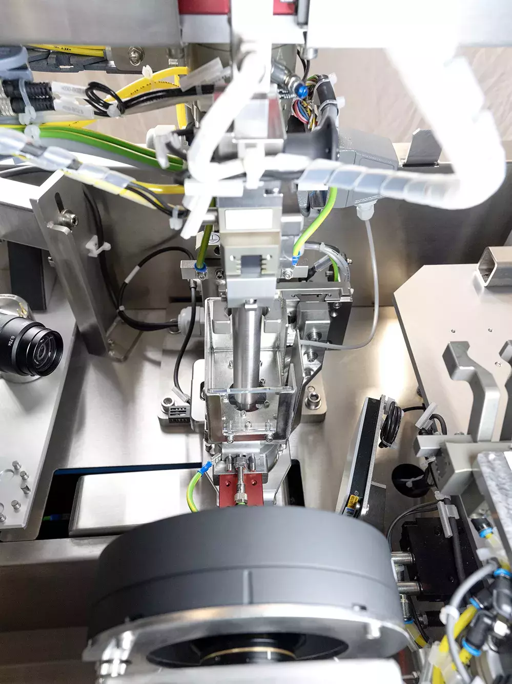 “这套系统的测量项目十分全面,且测量精度必须达到极高标准。医疗产品允许的公差范围极小,生产及检测流程必须具备绝对可靠性。” 均普项目经理Ramona Neulinger表示。针头保护罩的开启力、行程及压力数值,均由伺服压力机完成测量。针头完整性、药液滴落形态及排空提示标识的视觉检测,则由两套相机系统完成,单次检测过程可拍摄500张图像。用于测量药物注射剂量的精密天平,精度可达毫克级。为消除设备振动对测量结果的干扰,该天平在结构上与系统其他部分完全隔离。