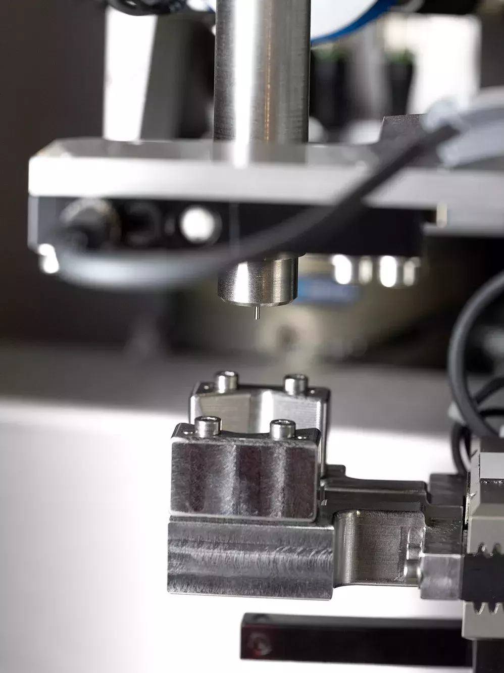 检测工位会对多项参数进行测量,包括触发注射所需的压力数值、注射器按压至启动的行程距离、注射开始到结束的时长,以及活性药物成分的注射剂量。自动注射器会将药物注入量杯内,供系统计量。