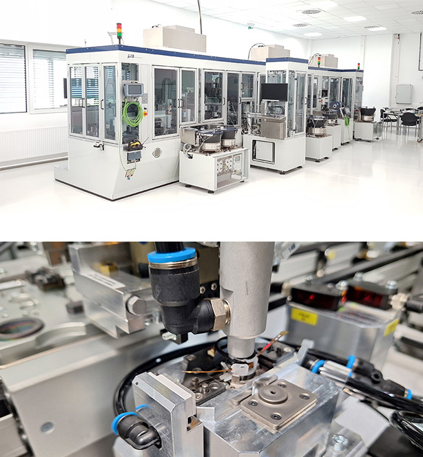 所有装配工序均实现100%自动化运行。工序包括热铆接工艺,具体操作为:利用加热工具对工件上的塑料柱进行加热塑形,从而将另一个零部件——如电路板,永久固定。在后续工序工位中,设备会依次完成显示屏、电子元件及电池的装配。沿生产线分布着多套相机检测系统,对各道生产工序进行实时监控。每一个剂量调节模块都配备专属编码,可实现产品全流程追溯。